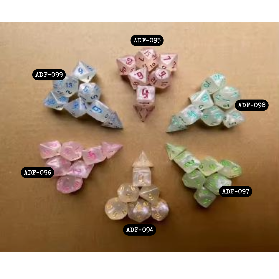 Set of 7 Acrylic Gaming Dice. D4, D6, D8, D10, D12, D20, & D%. Also for Dungeons and Dragons (DnD). Size: 16 mm. Weight: 26.5g